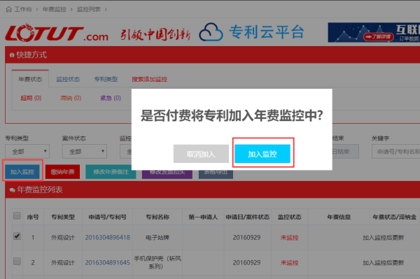 买专利卖专利找龙图腾,真高效! 查专利查商标用IPTOP,全免费!专利年费监控用IP管家,真方便! 点击监控列表,进入监控列表页面。