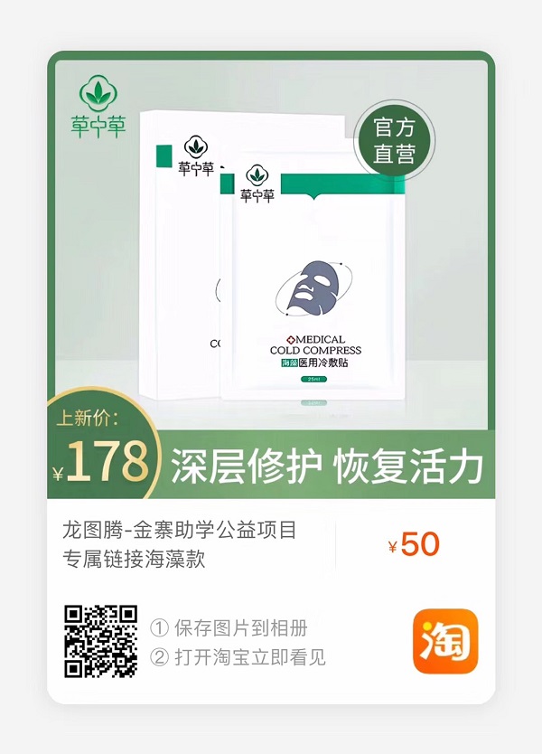 作为一家爱心企业,近期龙图腾公司将举行一场义卖活动,活动期间义卖商品所得收入将作为慈善款,全部捐赠给金寨县的贫困学校,用于贫困孩子们的助学基金。 1、活动时间:2020年3月13日18时—3月15日22时 2、活动商品:草中草医用冷敷贴,原价138元/盒,活动价40元/盒,买五送一 草中草海藻医用冷敷贴,原价178元/盒,活动价50元/盒,买五送一 3、活动方式:在线义卖,支付宝扫码选购,快递包邮