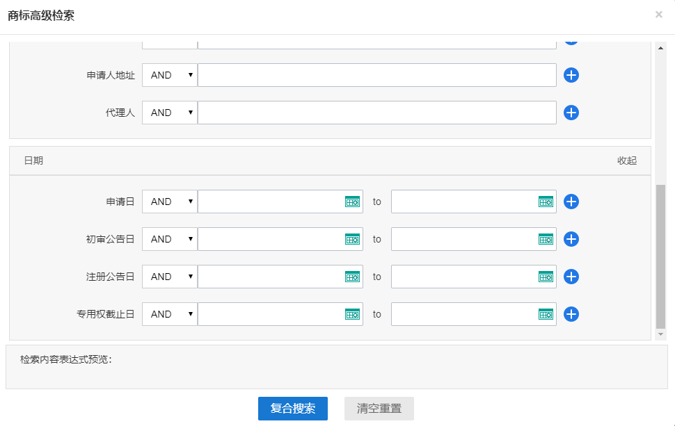 下拉滚动条,可以进一步的看到更多的界面,具体如下: 我们可以看出,专利高级检索里面包括了关键词检索、日期检索、号码检索、分类号检索以及名称地址检索,可以说是非常齐全了,能够满足专利行业的所有检索需求。