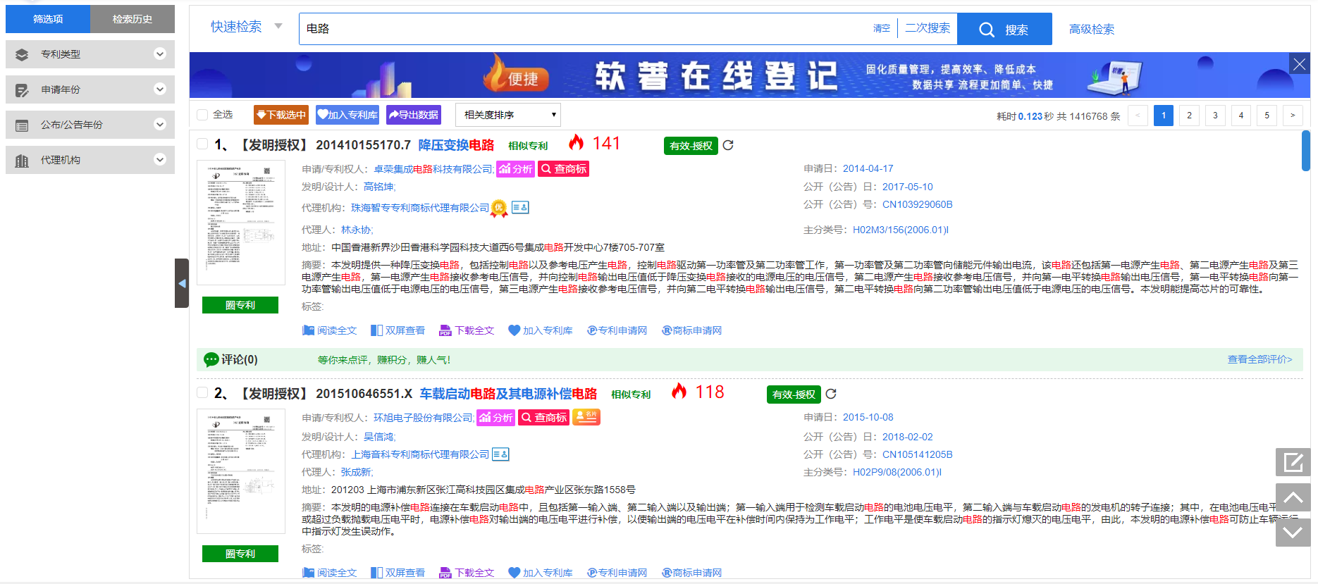 下面我就来实战演练一遍看看吧,我们先来看看专利检索,我们以“电路”为关键词看看搜出来的是什么样的界面。