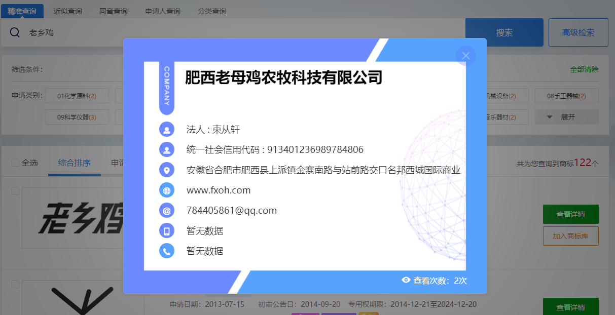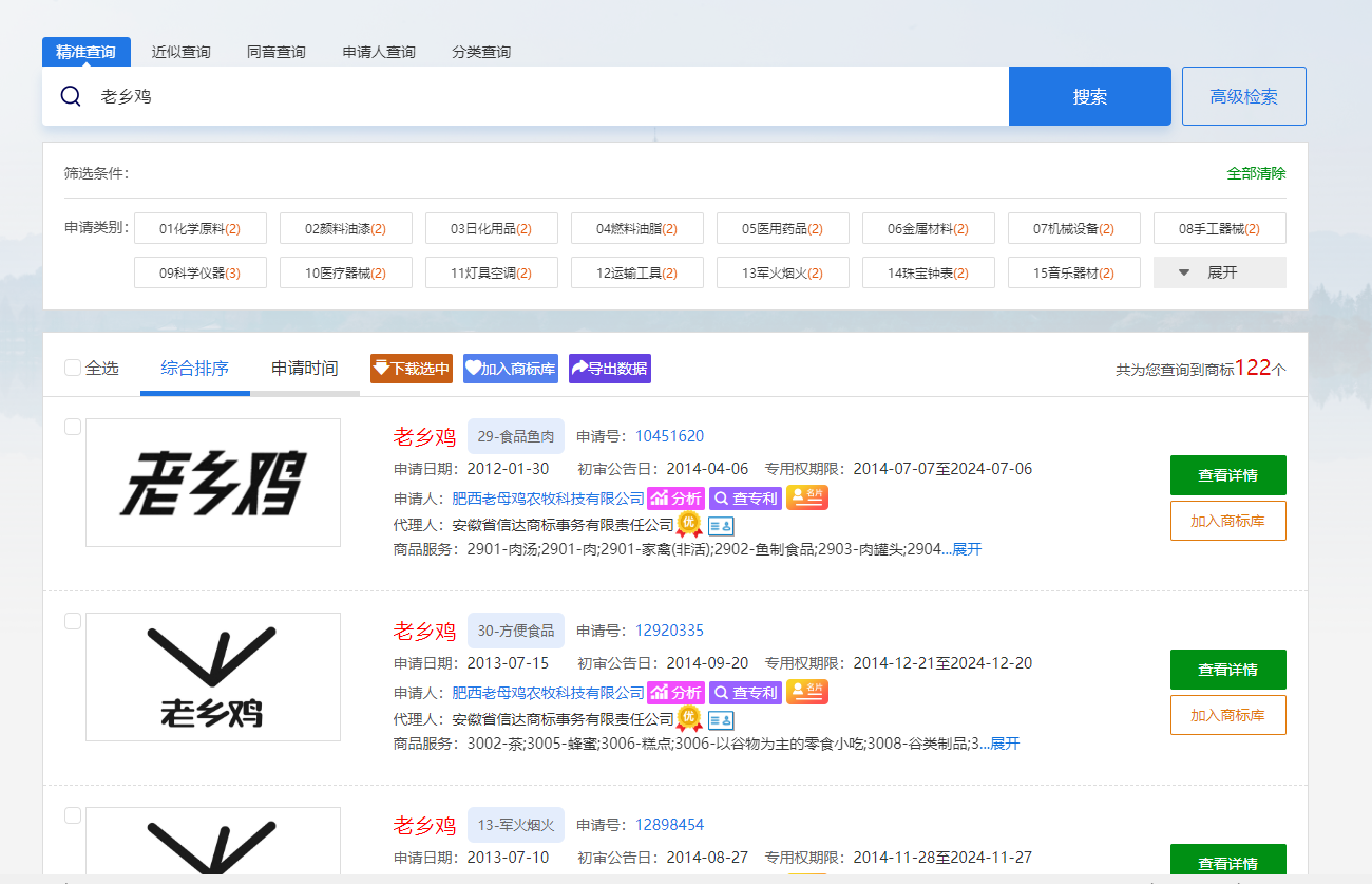 可以看到,原来是对该专利的专利权人所有的商标权数据进行了分析,也是非常nice的一个功能。 接下来,我们再回到龙图腾IPTOP的首页试试商标查询功能,我们以“老乡鸡”为例进行查询,结果如下: