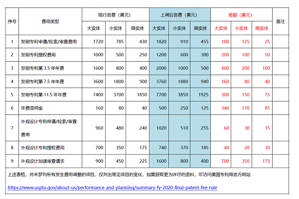 美国专利及商标局五大办公楼之一,詹姆斯·麦迪逊大楼 近期,美国专利及商标局(下文中简称美国专利局),公布了2020财年的官方费用上调方案,本次费用调整将于2020年10月2日起实施,为近三年来的首次官费上涨。基本上,发明专利(utility patent)、外观设计专利(design patent)的申请、检索和审查及授权、维持费等均有上调,幅度约为5%,同时本次费用调整,仅针对专利部分,商标官费并未受到影响。 根据美国专利局信息,2017年,美国专利局,既已开始了两年一次的费用成本核算,决定上调收费,据悉,本次费用调整,也是为了提高专利审查质量、缩短审查时间、建设现代化的专利信息技术系统并在经济困难时期维持美国专利局的稳定运营。比较值得注意的是,美国专利局大幅提高了发明专利年费的滞纳金,由160美元,上调至500美元;另外还上调了请求外观设计专利加速审查的官费,由900美元,至1600美元,涨幅约78%。而发明专利的年费,也有不同程度的上涨,第3.5年年费由1600美元,上涨至2000美元,第7.5年年费,上涨了160美元,至3760美元,第11.5年年费上涨至7700美元,详情参见下表。