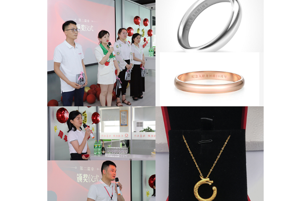 为了迎接龙图腾十三周岁生日,公司给全体员工发放了龙图腾定制玻尿酸精华液,刘总亲自为入职五周年员工、十周年员工送上"纪念入职龙图腾周年"版定制戒指,同时也为入职十周年员工的父母献上金项链一条。为2020年度销售冠军及发明授权率第一名的小伙伴各颁发金项链一条。庆典同时也为六月份可爱的龙精灵们送上生日祝福。
