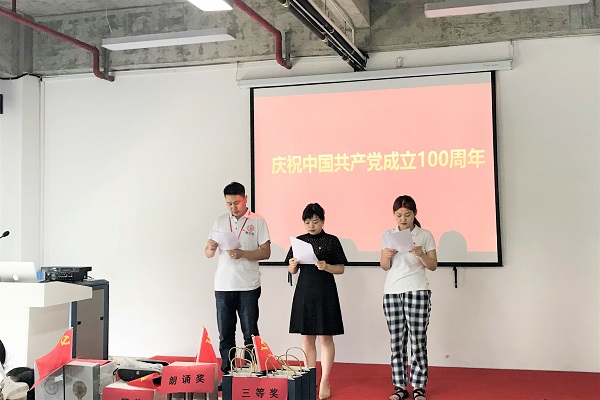 朗诵——百年看党 陈薇、王建国、李佳慧作为党员代表分别从关于党的历史简介、关于中国共产党历届会议、关于党的历程、关于红色地标里的党史四个方面声情并茂的演绎。