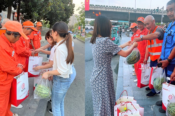 七月以来,炎炎夏日持续高温,让人酷暑难当。当大家都躲进空调屋纳凉时,我们的城市美容师——环卫工人却头顶烈日,在道路上与高温高湿“战斗”用辛勤汗水换来城市的清净整洁7月22日傍晚,龙图腾人事部的小伙伴们来到了蜀山区大铺头,用实际行动为高温下的劳动者送去缕缕清凉。