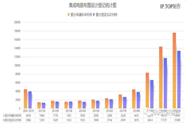 买专利卖专利找龙图腾,真高效! 查专利查商标用IPTOP,全免费!专利年费监控用IP管家,真方便! 一、基本概况 我国《集成电路布图设计保护条例》于2001年10月1日起施行,在实施当天上海复旦微电子股份有限公司提交了名称为:FM1008 8KCPU卡电路的集成电路布图设计,该申请于2001年12月07日公告,登记号为:BS.01500001X,公告号为1;截止至2021年12月31日,我国集成电路布图设计累计发证52259件,从2019年开始出现爆发式增长,近3年的累计发证量占总量的60.7%;累计发证量排名前五的地区依次为:1、广东省12171件,2、江苏省8789件,3、上海市8342件,4、北京市2734件,5、浙江省2685件;累计发证量排名前五的权利人依次为:1、美国亚德诺半导体公司943件,2、上海艾为电子技术股份有限公司445件,3、深圳市明微电子股份有限公司282件、4、上海复旦微电子集团股份有限公司248件,5、上海贝岭股份有限公司246件。以上数据来源龙图腾IPTOP知识产权平台的集成电路栏目。 二、年度统计 截止至2021年12月31日,通过龙图腾IPTOP知识产权平台的集成电路栏目进行数据分析得到:我国集成电路布图设计累计发证52259件,从2019年开始出现爆发式增长,近3年的累计发证量占总量的60.7%;具体年度的申请和发证数据如下图所示。