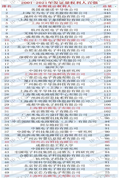 四、权利人排名 截止至2021年12月31日,通过龙图腾IPTOP知识产权平台的集成电路栏目进行数据分析得到:累计发证量排名前五的权利人依次为:1、美国亚德诺半导体公司943件,2、上海艾为电子技术股份有限公司445件,3、深圳市明微电子股份有限公司282件、4、上海复旦微电子集团股份有限公司248件,5、上海贝岭股份有限公司246件;其中第1名美国公司的登记量接近第2-4名我国公司的总和,可见我国集成电路实力较发达国家仍有很大差距;前100名的发证数据如下图所示。